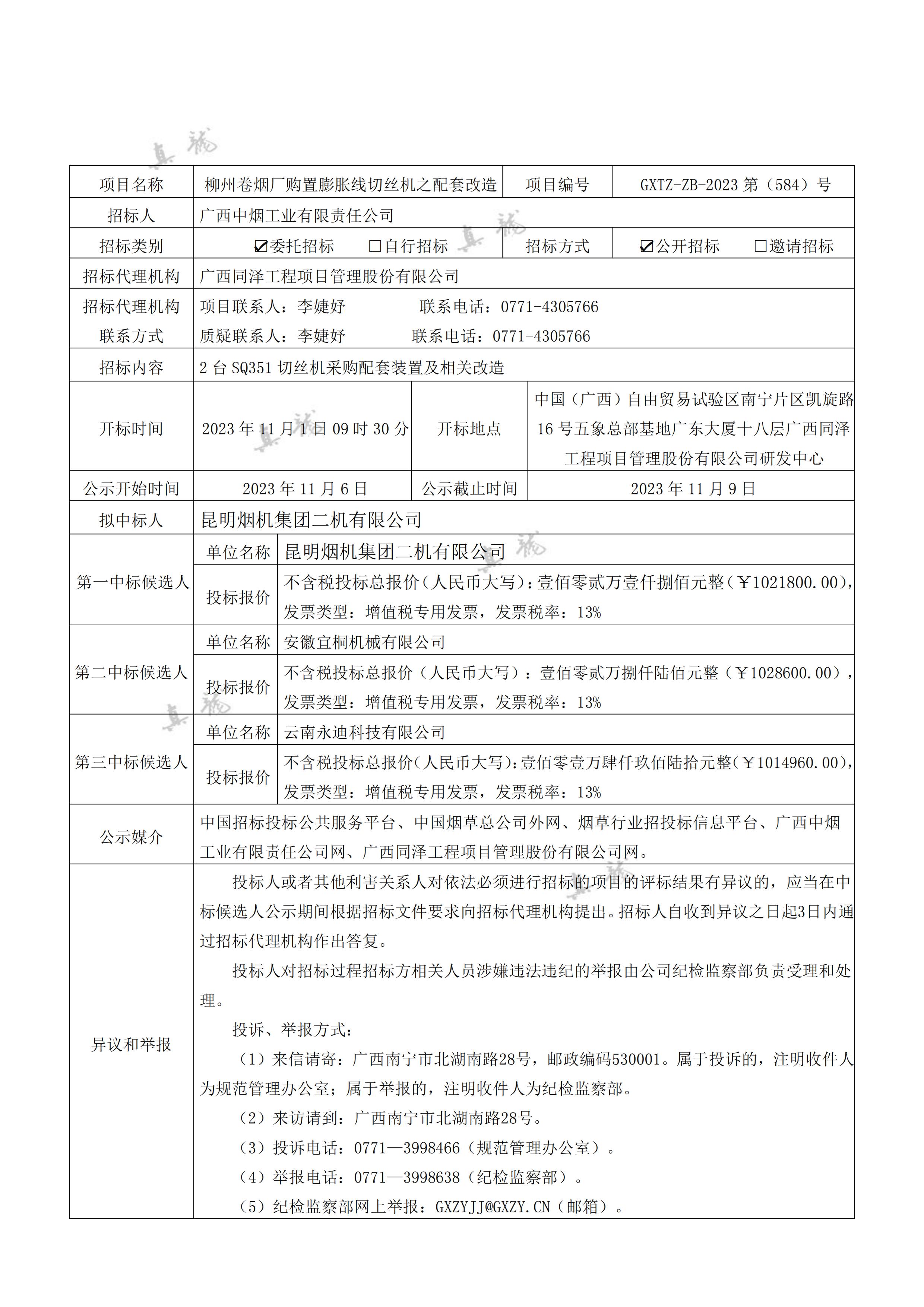 廣西中煙工業(yè)有限責(zé)任公司柳州卷煙廠購置膨脹線切絲機(jī)之配套改造(項(xiàng)目編號(hào):GXTZ-ZB-2023第(584)號(hào))中標(biāo)候選人公示