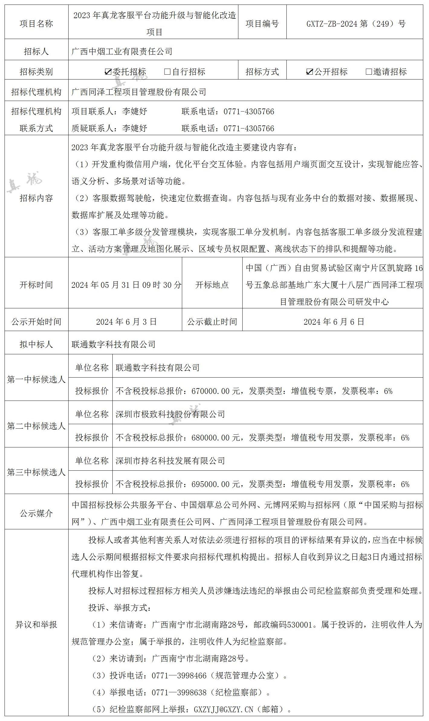廣西中煙工業(yè)有限責(zé)任公司2023年真龍客服平臺功能升級與智能化改造項目(項目編號:GXTZ-ZB-2024第(249)號)中標(biāo)候選人公示