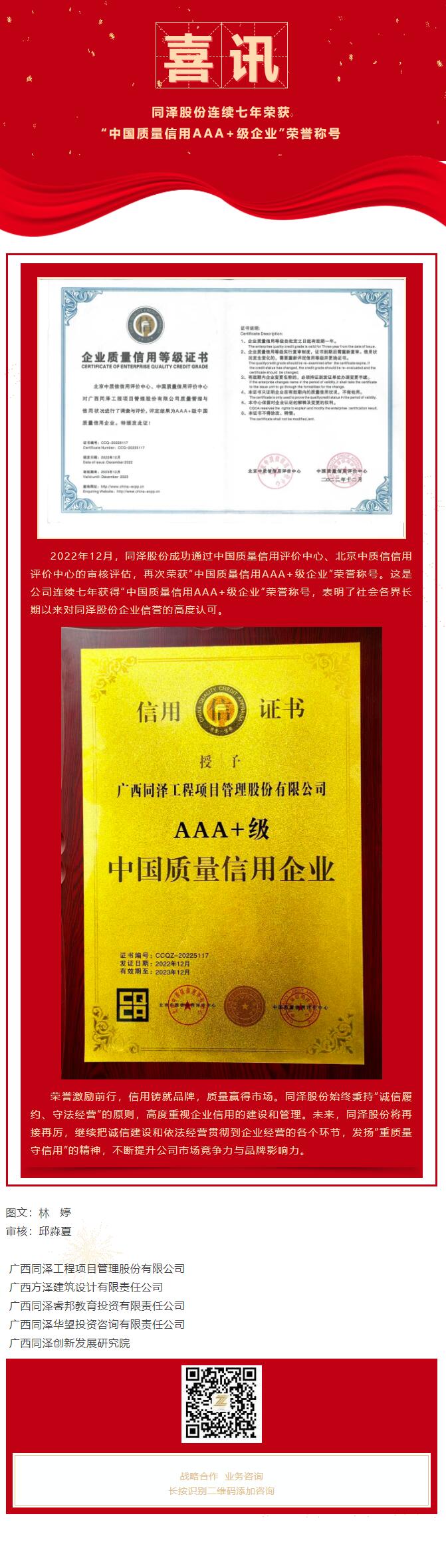 喜訊 | 同澤股份連續(xù)七年榮獲“中國質(zhì)量信用AAA+級企業(yè)”榮譽稱號